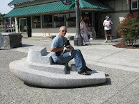 Upon our return to Penticton we found a Pub right on the race route and decided to have lunch on the balcony and watch the event. While looking for a parking spot we even saw the top three male contestants who were well into the marathon portion while everyone else was just starting the biking! At the Pub there were a group of individuals (4 girls & 2 guys) called the Portland Ironheads. We are not sure but they appeared to be race “groupies” dressed up in bright spandex, Viking helmets, tutus, funny wigs, etc, and encouraging the contestants with cow bells, horns, and megaphones. In fact, it appears that constant support of all the contestants is part of the fun of being a spectator? There were small and large groups of spectators throughout town equipped with cow bells, clappers, and/or horns yelling every racer onward (on one corner was a very good “bongo” drum group playing for the racers). Some family members and friends even had special t-shirts for their racer. That night the local TV station was still broadcasting the race live sixteen hours into the event.